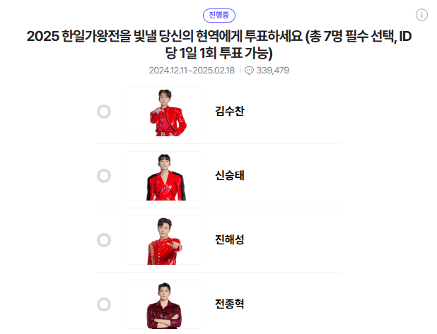 Tip: 네이버 ID당 하루 한 번 투표할 수 있으며, 매일 7명의 참가자를 선택해야 투표가 완료됩니다.